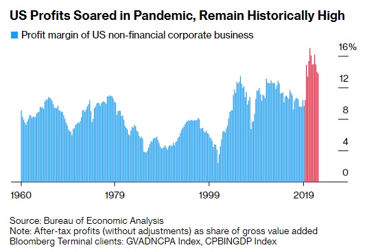 疫情的独特环境——严重的供应限制,以及随后前所未有的刺激性需求爆发——是利润率不断扩大的原因,这让利润率在美国创下70年来新高。