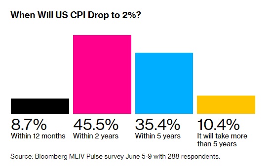 只有10%的人表示,美国总体消费者价格通胀率需要五年多的时间才能回到2%左右的稳定水平。超过一半的人认为通胀率将在两年内回到2%的水平——基于目前约2.1%的两年盈亏平衡率,这与市场观点一致。