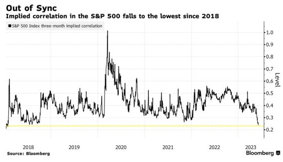 有一种观点认为,个股特有的因素最近发挥了更大的影响,超过了对宏观经济的担忧。主要证据是,衡量标普500指数成分股三个月后预期相关性的指标上周跌至2018年以来的水平。通常情况下,当经济担忧成为主要驱动因素时,股市的相关性会增强,而不是减弱。