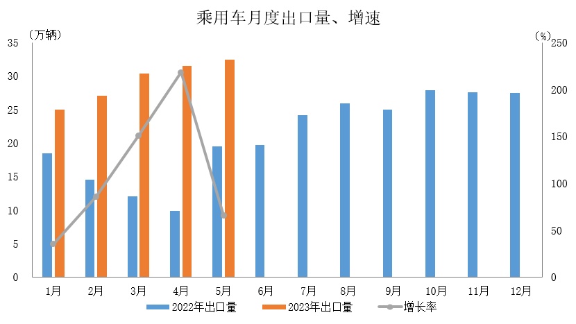 2023年5月,乘用车本月出口32.5万辆,环比增长3.1%,同比增长66.3%。2023年1-5月,乘用车出口146.7万辆,同比增长96.6%。