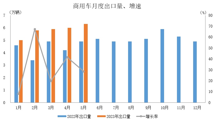 2023年5月,商用车出口6.3万辆,环比增长5.2%,同比增长28.6%。2023年1-5月,商用车出口29.1万辆,同比增长30.9%。