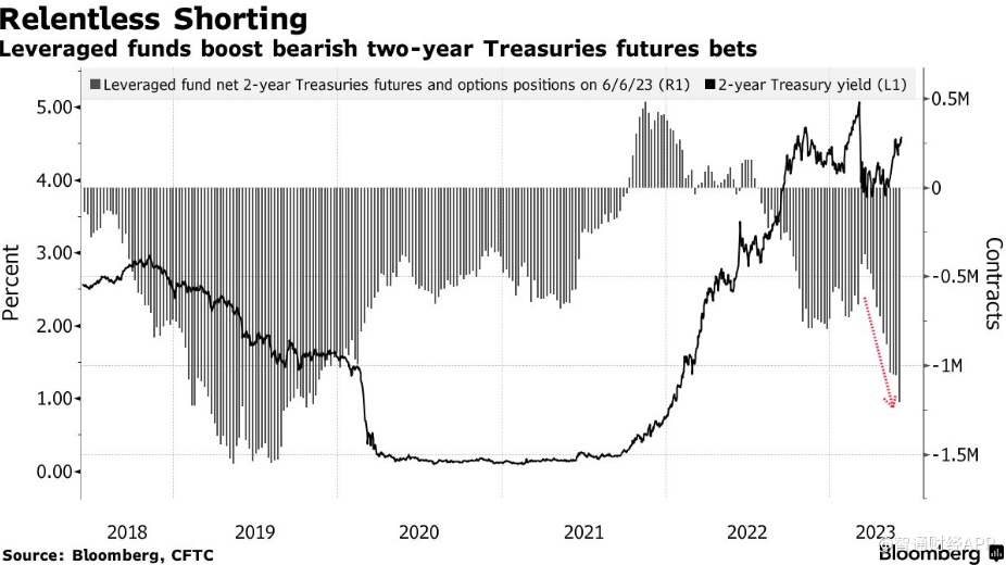 智通财经APP获悉,对冲基金继续创纪录地抛售短期美国国债,押注美联储与通胀的斗争远未结束。美国商品期货交易委员会的数据显示,截至6月6日,杠杆投资者连续第11周增持两年期美国国债的净空头头寸,这是2006年有记录以来最长的一次。