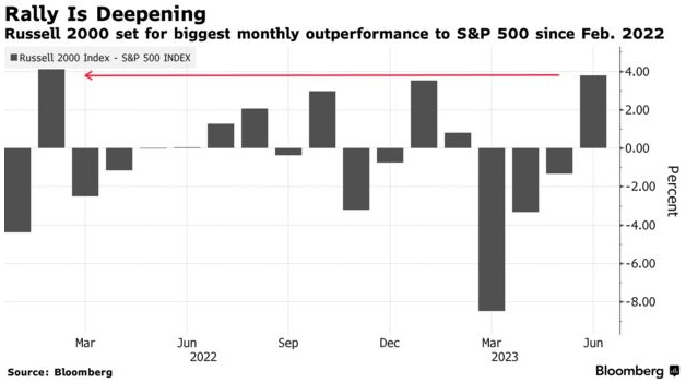 标普500指数自去年十月份的低点起涨了20%。与斯托克欧洲600指数、德国DAX指数和韩国Kospi指数一道,成为30年来第五次技术性牛市。目前已经停止了有关通胀和经济放缓的担忧,改为预测美联储可能会暂停加息和成分股企业将获得强劲的盈利。这轮涨势也开始显示出扩大的迹象,自6月初以来,罗素2000指数的表现优于标准普尔500指数。