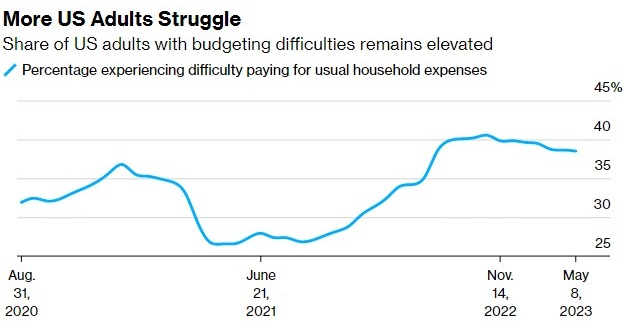 与此同时,美国人口普查局5月初公布的一项调查显示,与疫情刚结束时相比,现在有更多的美国人难以支付开支。据美国人口普查局“家庭脉搏”调查最新数据,截至5月8日的一周内,有大约38.5%(8910万)的美国成年人在支付家庭开支时遇到困难,这一数字较去年同期的34.4%和前年同期的26.7%均有所增加。为了解决支出问题,越来越多的居民转向信用卡:有超过2500万人表示他们使用信用卡或贷款来满足消费需求,这一数字同比增长了11.61%。