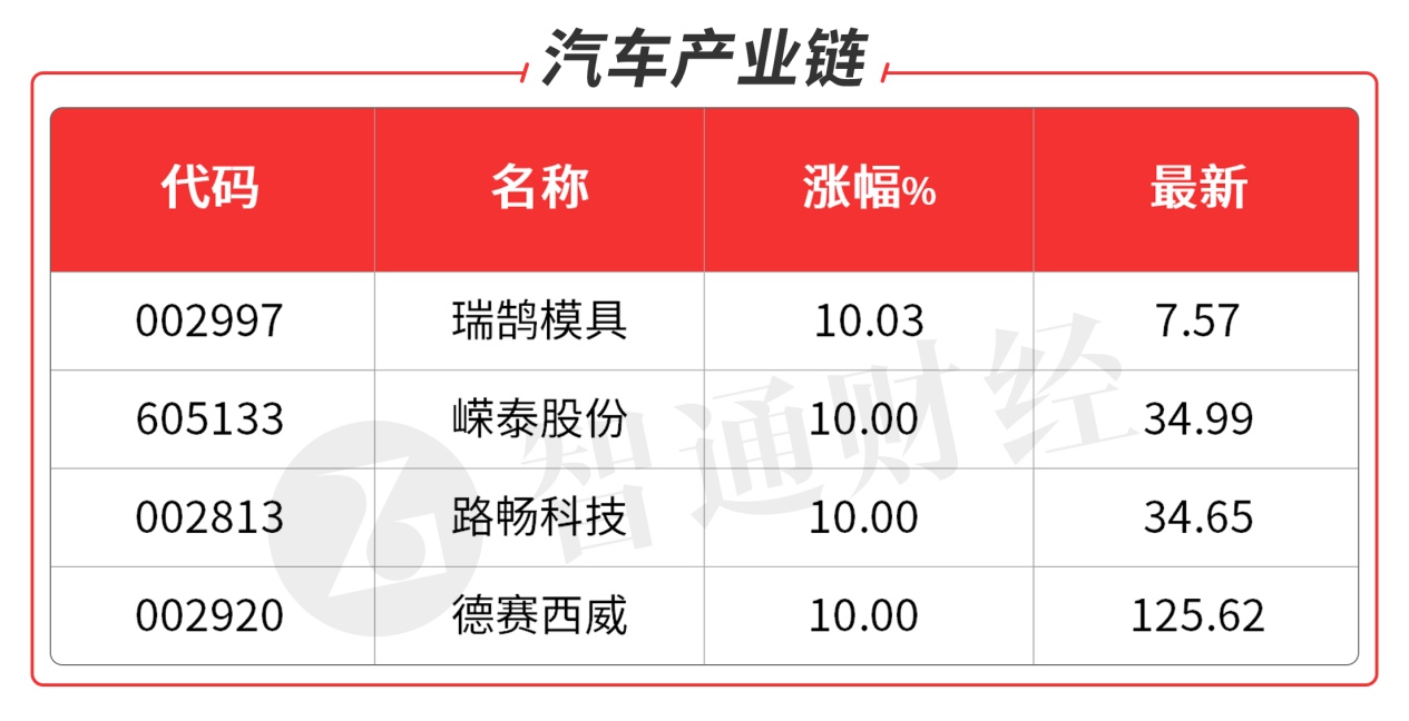 5月销售数据回暖,汽车产业链再度全面爆发,汽配、一体压铸、等方向领涨,反复提到的上海物贸(600822.SH)晋级6板,迪生力(603335.SH)晋级3板;一体化压铸概念泰祥股份(301192.SZ)2连板20CM涨停,联明股份(603006.SH)2连板;金钟股份(301133.SZ)、博俊科技(300926.SZ)均获20CM涨停;瑞鹄模具(002997.SZ)、文灿股份(603348.SH)、嵘泰股份(605133.SH)等大面积涨停。