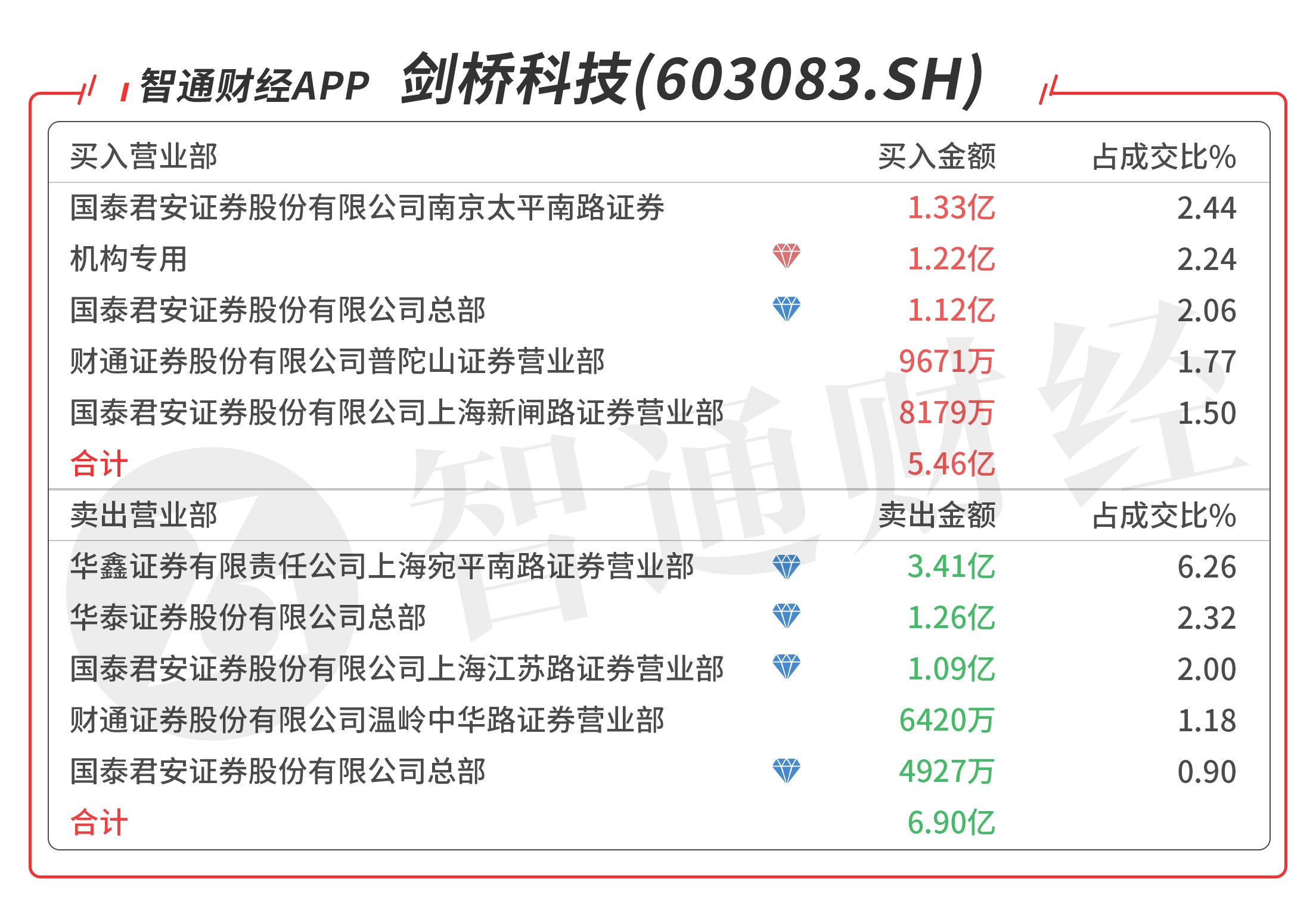 剑桥科技(603083.SH):龙虎榜阵容豪华,机构与游资出现分歧,机构席位买入1.22亿元,买一是顶级游资作手新一的席位买入1.33万元,买三是知名游资的席位买入1.12亿元,当日净卖出1.44亿元,该股今日突破所有均线,有望冲击近期高点。