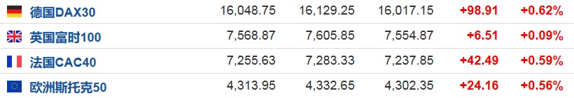 2.截至发稿,德国DAX指数涨0.62%,英国富时100指数涨0.09%,法国CAC40指数涨0.59%,欧洲斯托克50指数涨0.56%。
