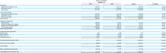 2021-2022财年,公司的应用程序开发服务分别实现收入397.71万美元、338.03万美元,同比下降约15%,对此,公司解释称由于业务重点转移到SaaS订阅服务,致使该年度完成的合同减少。