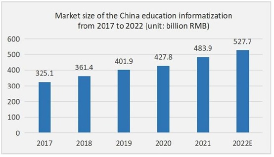 在强有力的政策支持下,2017年至2020年中国教育信息化市场进入快速增长阶段,行业总收入从3251亿元增长到4278亿元,复合年增长率为9.6%。2020年到2022年,中国教育信息化市场的总收入预计将以9.4%的复合年增长率增长。