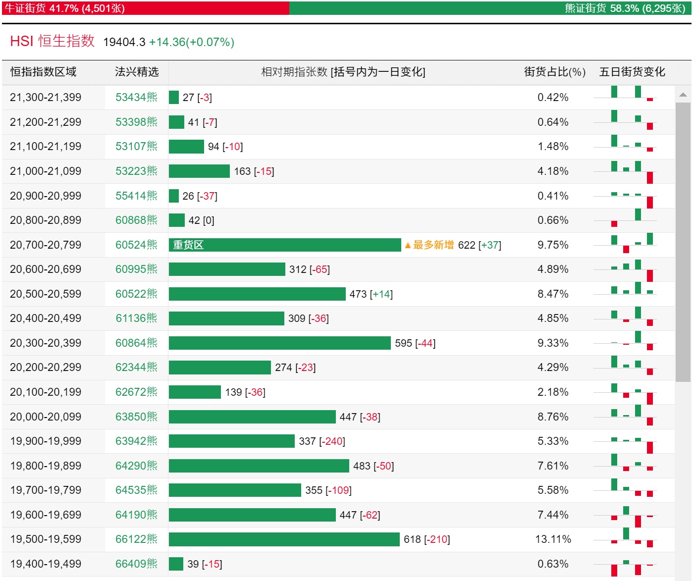法兴恒指牛熊证街货分布图中的数据显示,熊证街货重货区和最多新增都在20700-20799区间,该区间最新熊证数量为622张,较上一交易日增加37张。
