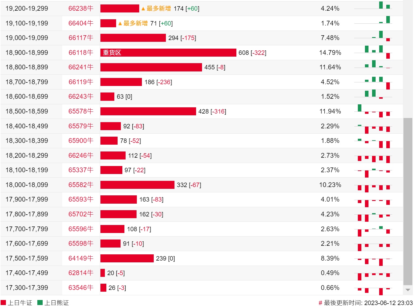 牛证街货重货区在18900-18999区间,该区间最新牛证数量为608张,较上一交易日减少322张;最多新增在19200-19299区间,该区间最新牛证数量为174张,较上一交易日增加60张。