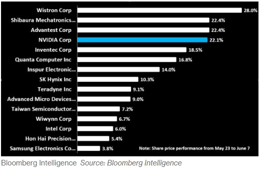 BI还指出,来自美国的泰瑞达(TER.US)和日本的Advantest Corp.的半导体测试设备可能会从围绕人工智能的热潮中受益。