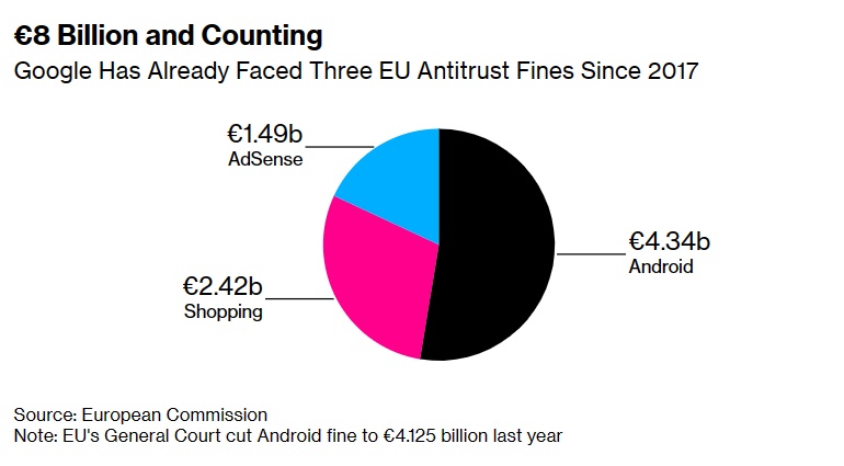 80亿欧元,而且可能增加——自2017年以来,谷歌已经面临三项欧盟反垄断罚款