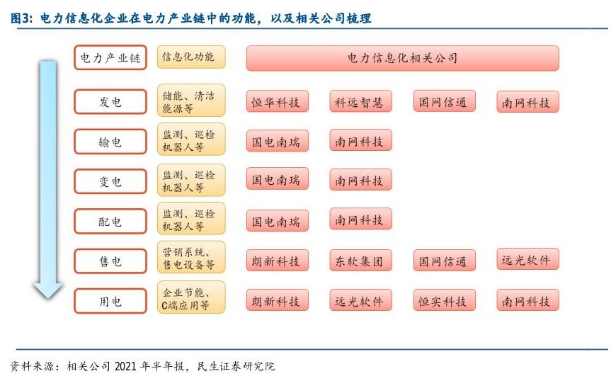 据了解,民生证券研究院历史整理的电力信息化产业链公司中,涉及恒华科技、科远智慧、国网信通、南网科技、国电南瑞、朗新科技、远光软件、恒实科技等A股公司。