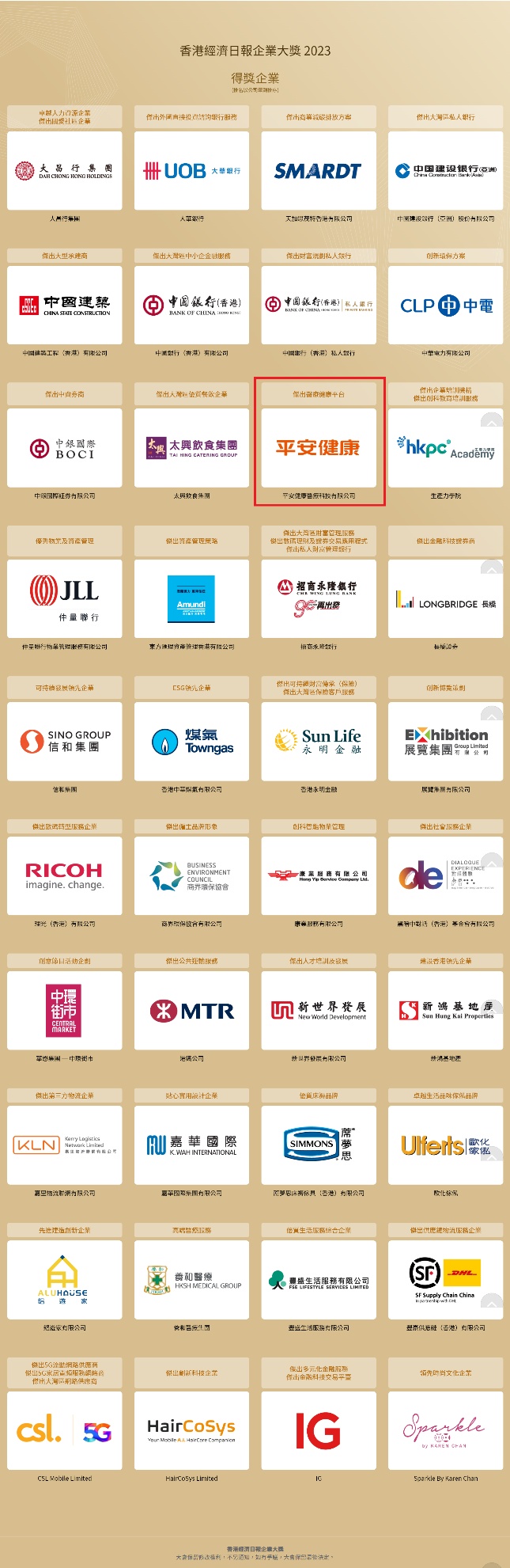 “香港经济日报企业大奖 2023”由香港最具影响力的财经媒体之一《香港经济日报》主办,该奖旨在肯定过去一年在各行业中拥有出色表现、对大湾区经济或社会发展带来贡献和卓越成就的企业,向各行业展示成功楷模,推动业界藉良性竞争,不断进步。平安健康的业务表现、可持续发展及企业文化等均符合评审准则中“理念及价值倡议”、“策略及执行”、“成效及贡献”、“未来愿景及计划”四个要求,成为“杰出医疗健康平台奖”奖项类别唯一获奖公司。