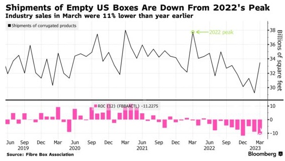 纸箱几乎出现在商品供应链的每一个环节,这使得纸业成为反映消费者需求状况的一个关键指标。美国瓦楞纸箱产品行业的销量下滑,3月份的空纸箱出货量同比下降11%。