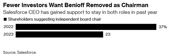 与去年相比,支持董事会由现任或前任CEO以外的人领导的股东减少了。监管备案文件显示,这项不具约束力的提案在6月8日的公司年会上获得了约23%的投票,而一年前这一比例还不到37%。该提案实际上是对Benioff是否应该继续担任董事会主席的公投。