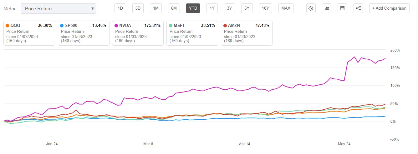 这一预测出炉之际,美股市场围绕人工智能(AI)的投资热潮已经将美股推入“技术性牛市”——美股基准指数标普500指数自2022年10月份低点累计反弹超20%,这一数值为普遍意义上的牛市门槛。此外,随着英伟达、微软和亚马逊等“AI领头羊”股价飙升,推动美股科技股基准指数——纳斯达克100指数早已步入技术牛市,今年涨幅接近35%。