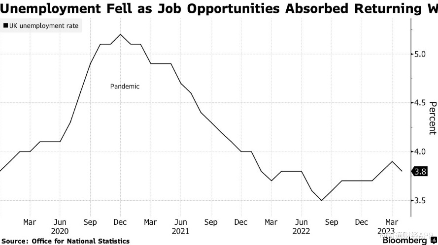 智通财经APP获悉,由于工资飙升和失业率下降,英国劳动力市场在4月份意外收紧,加剧了令英国央行担忧的通胀压力。英国国家统计局周二表示,在截至4月份的三个月里,失业率降至3.8%,市场预期为4%。不包括奖金在内的平均收入增幅升至疫情时期以外的最高水平。