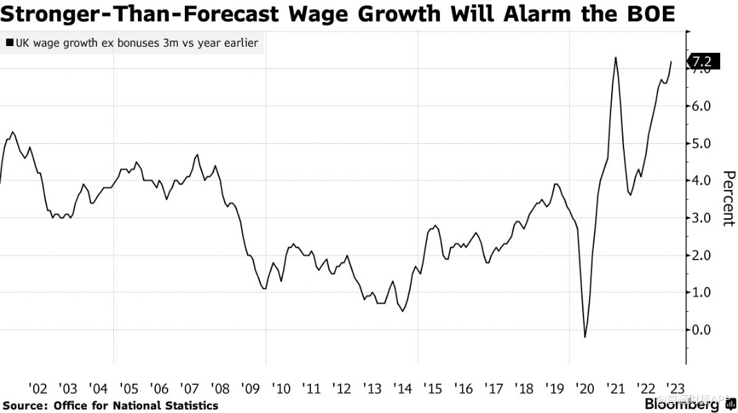 英国最低工资增长也推动了4月份的工资增长。总体而言,不包括奖金在内的薪酬增长加速至7.2%,是除疫情外有记录以来的最高水平。在私营部门,工资增长了7.6%,这也是一个创纪录的增长,不包括因疫情封锁而扭曲的时期。