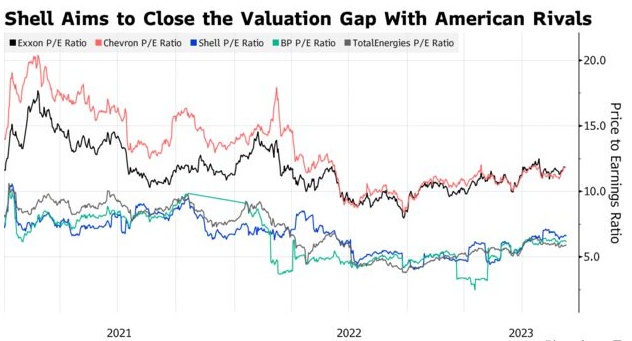 自欧美石油巨头几年前开始战略分化以来,投资者一直在用自己的钱包投票。这些美国公司的估值一直较高,因为它们对油气的关注带来了更好的回报。仅雪佛龙一家公司就承诺通过股票回购向股东提供数百亿美元,令欧洲公司的类似计划相形见绌。
