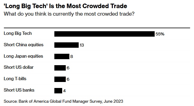 智通财经APP获悉,美国银行对全球基金经理的最新调查显示,在围绕人工智能的热潮中,投资者只做多科技股。55%的受访者表示,做多大型科技股是最拥挤的交易。不过,美国银行策略师Michael Hartnett在一份报告中指出,基金经理仍然普遍减持股票,因为以现金水平、经济增长预期和资产配置衡量的市场人气仍然低迷,投资者的股票配置水平降至5个月以来的低点。