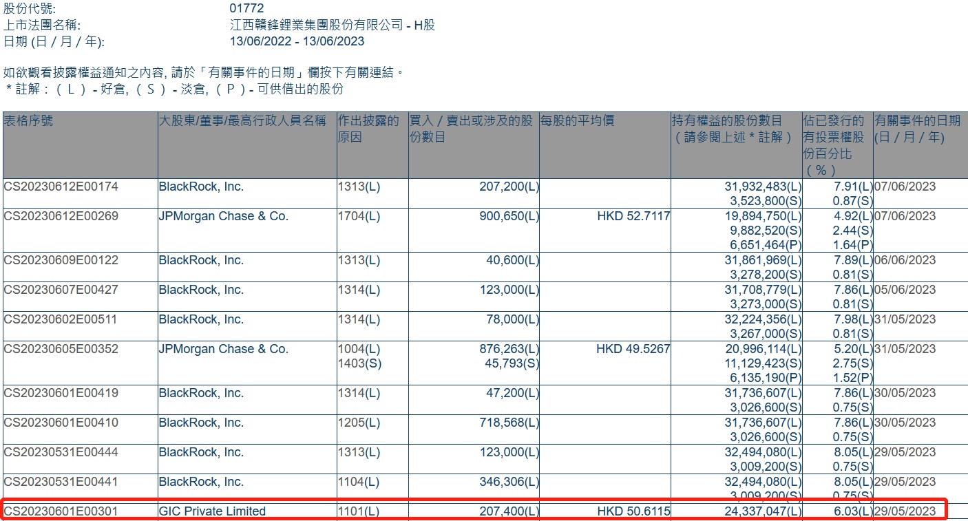 智通财经APP获悉,香港联交所最新资料显示,5月29日,GIC Private Limited增持赣锋锂业(01772)20.74万股,每股作价50.6115港元,总金额约为1049.68万港元。增持后最新持股数目约为2433.70万股,最新持股比例为6.03%。