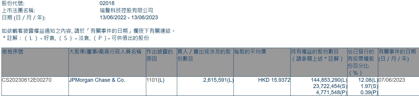 智通财经APP获悉,香港联交所最新资料显示,6月7日,小摩增持瑞声科技(02018)261.5591万股,每股作价15.9372港元,总金额约为4168.52万港元。增持后最新持股数目约为1.45亿股,最新持股比例为12.08%。