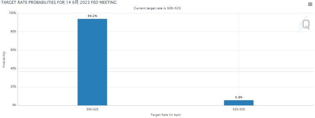 通胀的降温让市场普遍预计美联储将在6月暂停加息。根据CME“美联储观察工具”,市场目前预计美联储6月暂停加息的概率为94.2%,较数据公布前的79%有所上升。