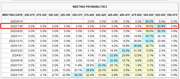 现在最大的问题是,美联储是否倾向于在7月份加息。他们可能会对整体CPI的放缓表示欢迎,但核心CPI将继续令人担忧,这可能为下个月加息提供理由。目前市场仍预计美联储将于7月加息25个基点的概率为60.6%,较数据公布前有所上升。