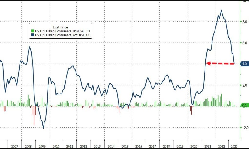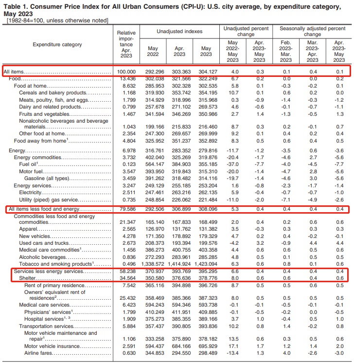 智通财经APP获悉,美国劳工部周二公布的数据显示,美国5月CPI同比增长4%,预期4.10%,前值4.90%,连续第11次下降,创2021年3月以来新低;5月CPI环比增长0.1%,预期为0.2%,前值为0.4%。剔除波动较大的食品和能源价格后,美国5月核心CPI环比增长0.4%,与预期一致,前值为0.4%;核心CPI同比增长5.3%,与预期一致,前值为5.3%。
