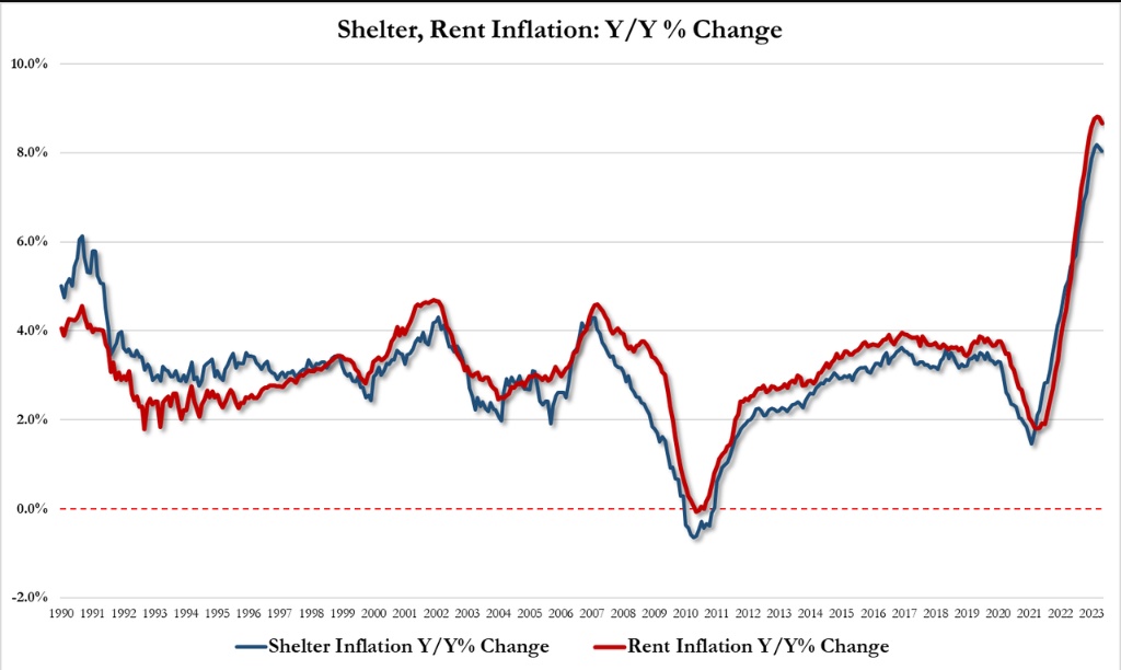 其中,住房指数是月度核心通胀上升的最大因素。由于租金价格继续飙升,上个月的核心通胀仍然特别棘手。住房通胀环比上升0.6%,同比上升8%。租金通胀指数和业主等效租金通胀指数均上升0.5%。业主等效租金是假设房主将支付的租金。