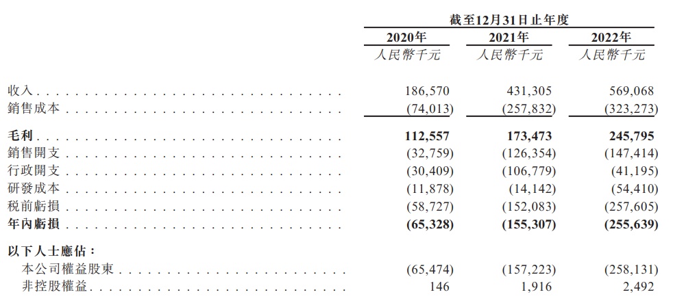 财务方面,截至2020年、2021年及2022年12月31日止年度,该公司的收入分别为人民币约1.87亿、4.31亿及5.69亿。同期,该公司亏损逐年增加,年内亏损分别为人民币约6532.8万、1.55亿及2.56亿。