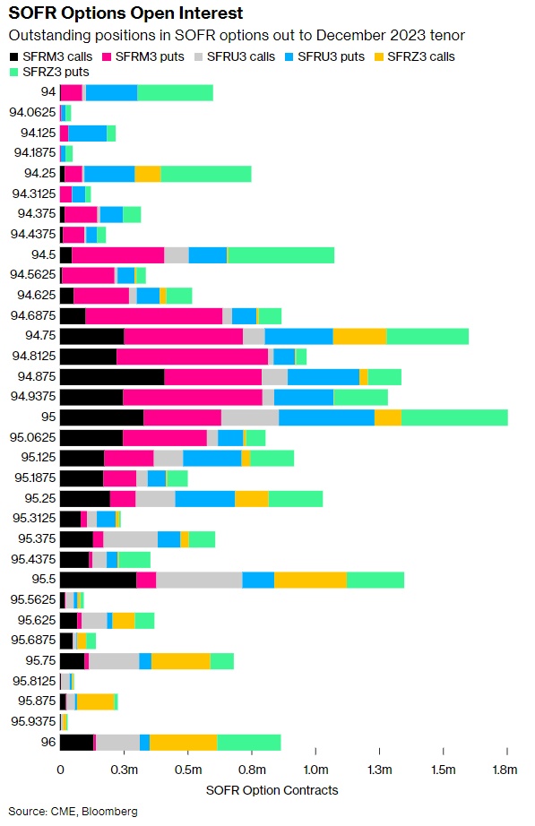 通胀数据公布后,基准担保隔夜融资利率(SOFR)期权的流动包括10万美元2023年12月看涨期权价差,这与美联储在年底前降息的对冲解除或调整相一致。