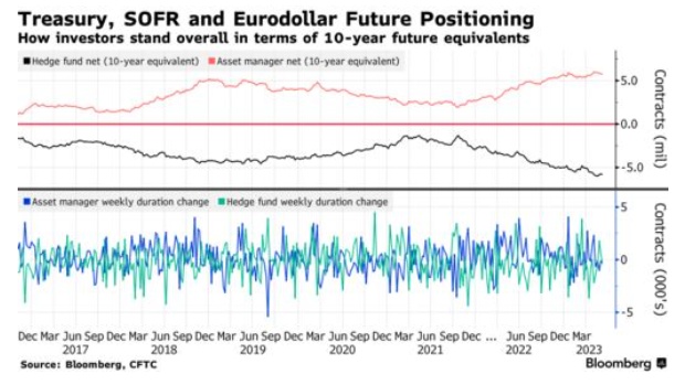 根据美国商品期货交易委员会(CFTC)截至6月6日的数据,资产管理公司的净多头头寸连续第五周减少。最新数据显示,本周10年期国债期货合约减少了32,500份,过去五周合计减少了221,839份。本周,对冲基金的净空头头寸增加了39,000份10年期国债期货合约。
