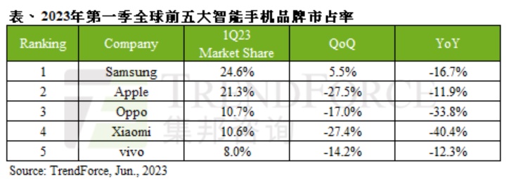 Oppo(含Oppo, Realme, OnePlus)考量市况不佳以及调节渠道库存而计划性减少产出,第一季产量为2680万支,环比减少17%,第二季可望受惠库存调节得宜,以及东南亚等地需求略有回升,产量有机会环比逾30%。值得一提的是,Oppo除了持续巩固中国市场高端机种的市占率,在南亚、东南亚、拉美市场销售成绩明显,其海外市场占其整体销售比重近6成。