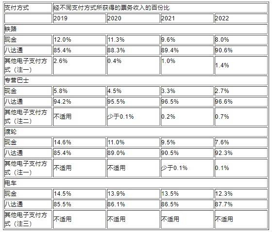 注三:电车营办商现正试行透过其他电子支付方式(包括二维码支付、信用卡感应式支付和流动支付)收取车费,预计将于今年九月完成试验。