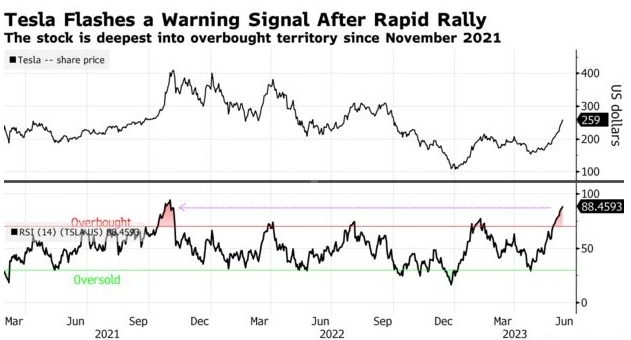 智通财经APP获悉,特斯拉公司(TSLA.US)创纪录的连续13个交易日上涨的势头似乎与市场力量发生了冲突。自5月下旬以来,这波闪电般的涨势使这家电动汽车制造商的估值增加了2400多亿美元,将该股推入所谓的超买区域——这一技术信号通常表明股价即将回落。