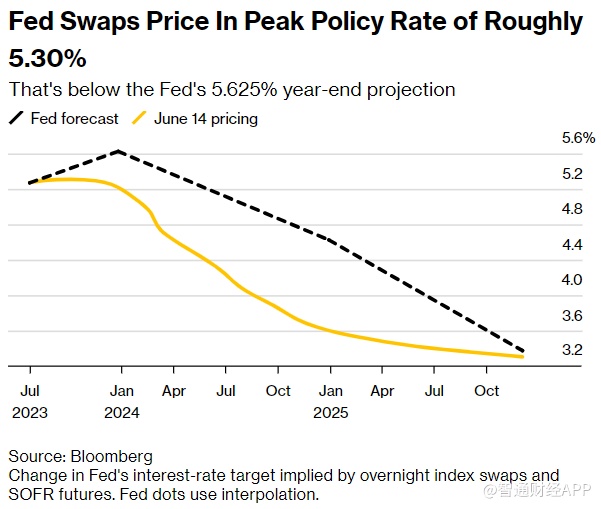 对未来美联储政策会议的互换合约利率反映出,在该央行公布6月利率决议后,9月份的利率峰值约为5.3%,而2023年12月的合约利率跃升至约5.2%。到今年年底,该利率比上周三早晨预期的峰值低约15个基点,更长期的合约继续预计2024年将会有降息。