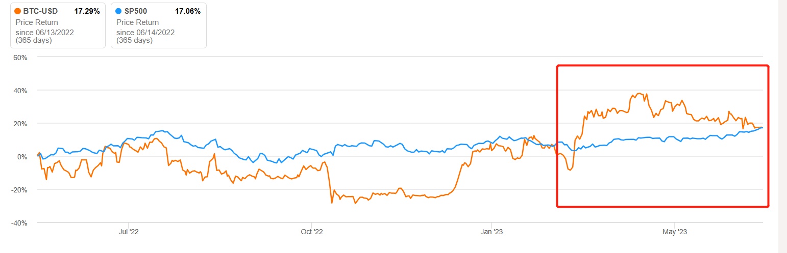 其他的Seeking Alpha分析师建议密切关注比特币和美股走势,最近几周两者都呈负相关,比特币较一个月前下跌6.4%,然而美股基准指数——标普500指数则上涨超过6%。