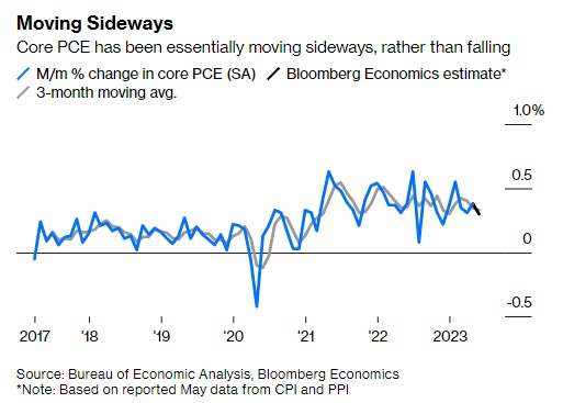 虽然鲍威尔能够在周三的会议上避开任何正式的反对意见,但经济预测摘要表明,一些政策制定者显然对通胀对自2022年3月以来500个基点的加息的反应方式感到不安。经济预测摘要中的“点阵图”显示利率有可能上升到6%到6.25%。总的来说,美联储首选的通胀指标——核心个人消费支出平减指数——在过去一年的大部分时间里基本上显示出了稳定的价格增长速度。按照这一标准,通胀没有加速,但也没有下降。与此同时,有迹象表明,对利率敏感的房地产市场可能已经开始略有反弹,就业市场仍相当有弹性。