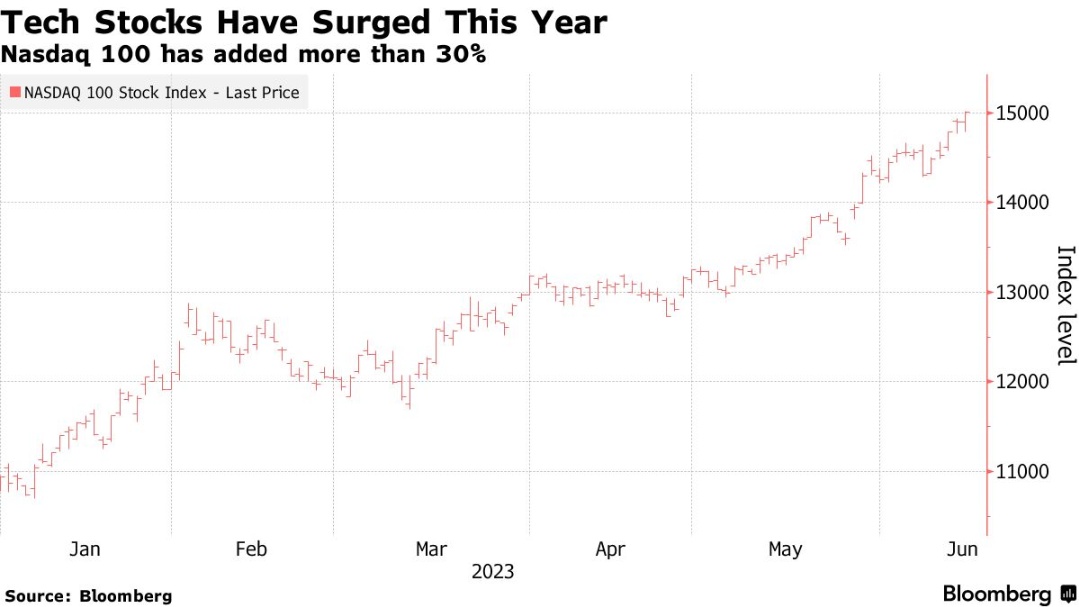 没有什么能改变股市多头对科技股的迷恋,科技股正在重新扮演它们在2020年疫情期间扮演的经济避风港角色。尽管四面八方都在发出泡沫警告,但纳斯达克100指数正走向连续第四个月上涨。在这段时间里,美国债务上限几乎陷入危机,债券市场越来越相信经济衰退不可避免。
