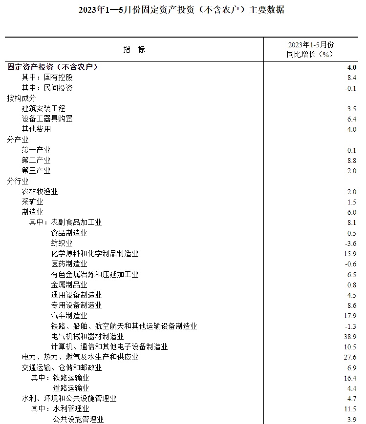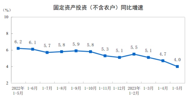 1—5月份,全国固定资产投资(不含农户)188815亿元,同比增长4.0%(按可比口径计算)。其中,民间固定资产投资101915亿元,同比下降0.1%。从环比看,5月份固定资产投资(不含农户)增长0.11%。