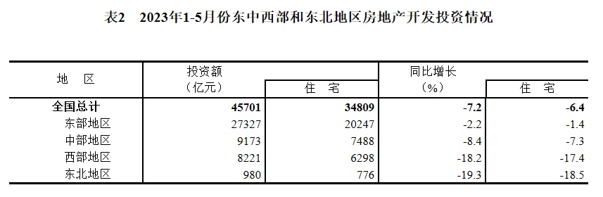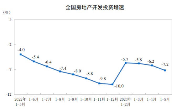 1—5月份,全国房地产开发投资45701亿元,同比下降7.2%(按可比口径计算,详见附注6);其中,住宅投资34809亿元,下降6.4%。