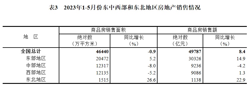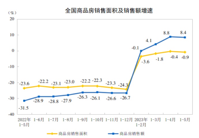1—5月份,商品房销售面积46440万平方米,同比下降0.9%,其中住宅销售面积增长2.3%。商品房销售额49787亿元,增长8.4%,其中住宅销售额增长11.9%。