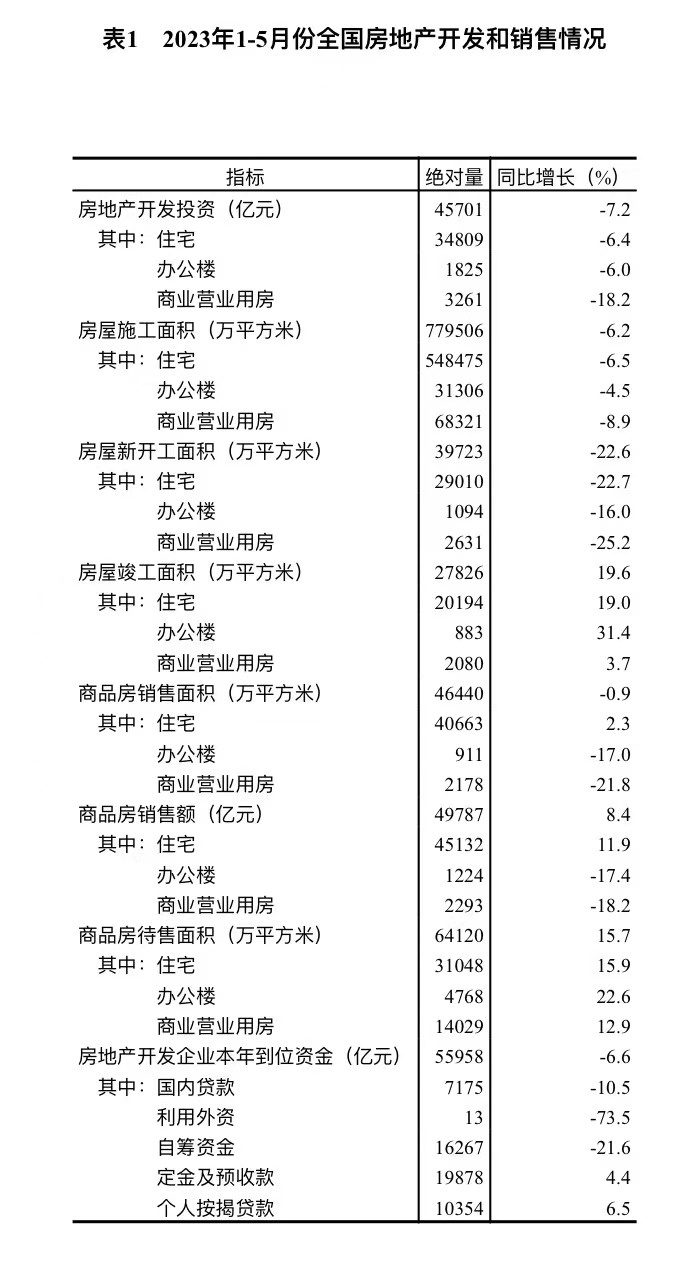 1—5月份,房地产开发企业房屋施工面积779506万平方米,同比下降6.2%。其中,住宅施工面积548475万平方米,下降6.5%。房屋新开工面积39723万平方米,下降22.6%。其中,住宅新开工面积29010万平方米,下降22.7%。房屋竣工面积27826万平方米,增长19.6%。其中,住宅竣工面积20194万平方米,增长19.0%。