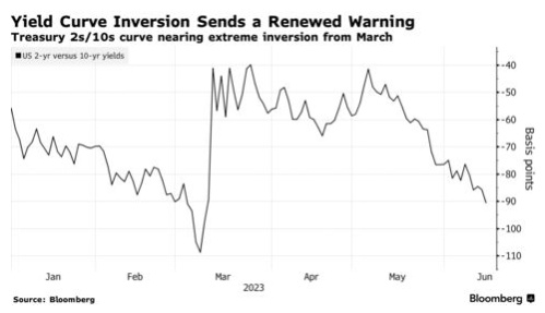 智通财经APP获悉,在美联储6月会议上宣布15个月以来首次暂停加息,但随后指出其准备在今年再加息50个基点后,周三,对政策敏感的短期国债遭到抛售,而长期国债则出现反弹。这使得收益率曲线倒挂(以两年期和10年期国债收益率之差衡量)超过90个基点,接近本轮紧缩周期109个基点的极端水平(上一次出现这一水平还是在3月份)。