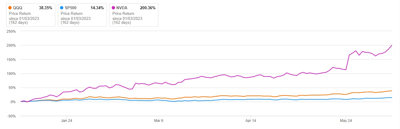 今年以来,全球市场围绕人工智能的投资狂潮愈演愈烈,其中,美股市场围绕人工智能(AI)的狂热情绪已经将美股推入“技术性牛市”——美股基准指数标普500指数自2022年10月份低点累计反弹超20%,这一数值为普遍意义上的牛市门槛。此外,随着英伟达和微软(MSFT.US)等“AI领头羊”股价飙升,推动美股科技股基准指数——纳斯达克100指数早已步入技术牛市,今年涨幅超37%。AI芯片领导者英伟达今年以来股价涨幅更是高达200%。