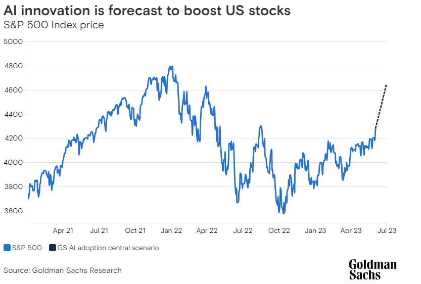 在投资者就可生成人工智能的优点展开辩论之际,一个关键问题是,它对股市可能意味着什么。以英伟达(NVDA.US)为例:上个月,这家芯片巨头表示,由于人工智能对其先进芯片的需求,预计当前季度销售额将达到110亿美元,比市场普遍预期的70亿美元高出53%。英伟达现在是美国标普500指数中的第五大市值公司。高盛研究团队表示,英伟达前景的大幅飞跃对投资者来说是一个鼓舞人心的发展,他们正在评估生成式人工智能将对其他公司的营收增速,以及至关重要的盈利能力产生多大影响。