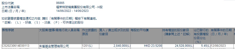 智通财经APP获悉,香港联交所最新资料显示,6月12日,朱雀基金减持福莱特玻璃(06865)284万股,每股作价23.52港元,总金额为6679.68万港元。减持后最新持股数目为2452.8万股,最新持股比例为5.45%。